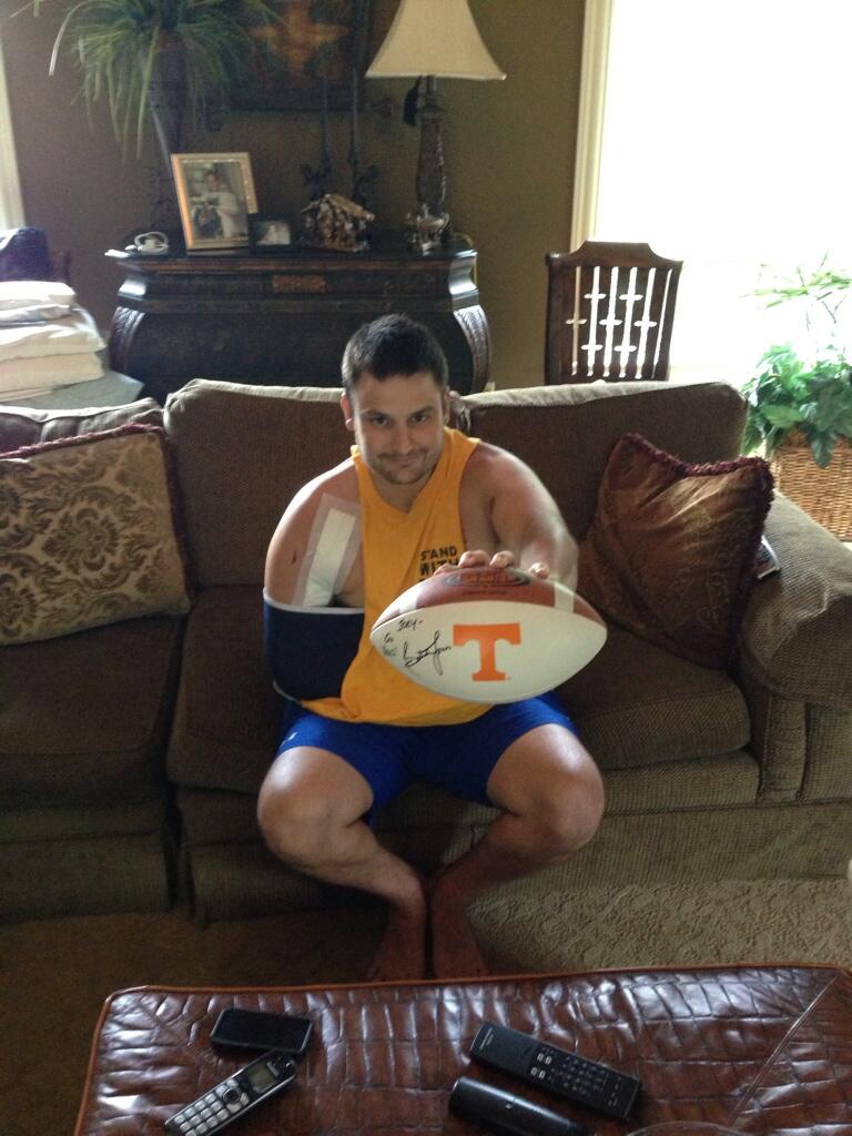 Butch not only gets the football side of things but he also understands what it means off the field to be leading such a tradition rich program. The Vols are more than just a football team to many around the south. They have a unique way of making an impact on others by being the state's football team. For example, like sending a signed football to a huge Big Orange Fan who is kicking cancer's ass. A buddy of mine, ChuckVols , who I met through Volquest is a die hard Vols fan. Chucks brother, a huge Vols fan himself, is battling bone cancer in his arm and has a few procedures to limit and ultimately try get rid of the cancer. Over the past week or so Chuck's brother had another procedure. Chuck reached out to one of the assistant coaches letting them know about his brother and his brother's passion for the Vols. The following days after the surgery Chuck was able to give his brother a signed football by Butch Jones himself. What an awesome move by Butch and the coaching staff. Chuck has said that his brother is doing awesome and he continues to fight the good fight. Here is a picture of Chuck's brother and his signed football! Butch gets it and his fandom as the Vols lead man continues to grow. Hats off to you Butch Jones and I cant wait to see you lift that crystal ball for the Big Orange one day!